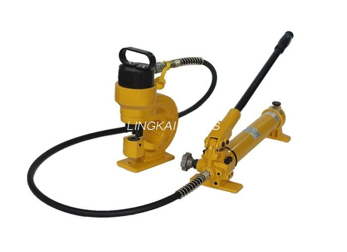 It is a remote control tool, works with an extremal hydraulic pump(Hand Foot or Electric pump). It is desighed to punch round holes on Cu/Al Busbar.With 4 pairs standard punching dies(10.5/13.8/17/20.5mm), punching hole size is between diameter 10.5mm and diameter 20.5mm. Busbar thickness should below or equivalent to 12mm. With hydraulic power, 4 pairs sharp punching dies, easy fast and clean punching can be achieved.