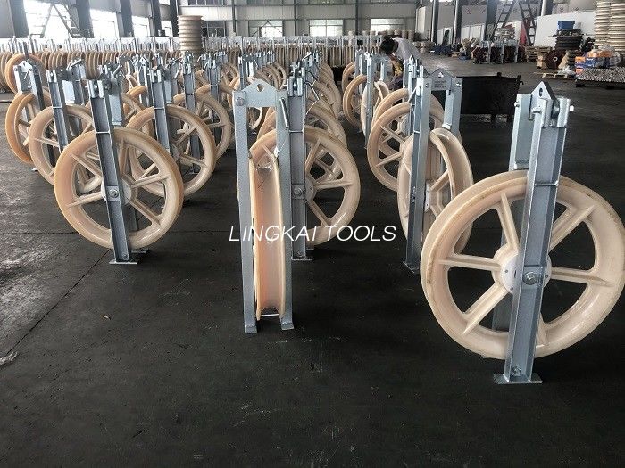 Application: It is suitable to string stranded aluminum and ACSR conductors on tangent structures. Compression sleeves, swivel connectors, and pulling rope connectors can pass through the groove. The sheave is made in high strength nylon. The big size 660mm, 822mm, 916mm, 1040mm nylon sheave can be lined with neoprene.